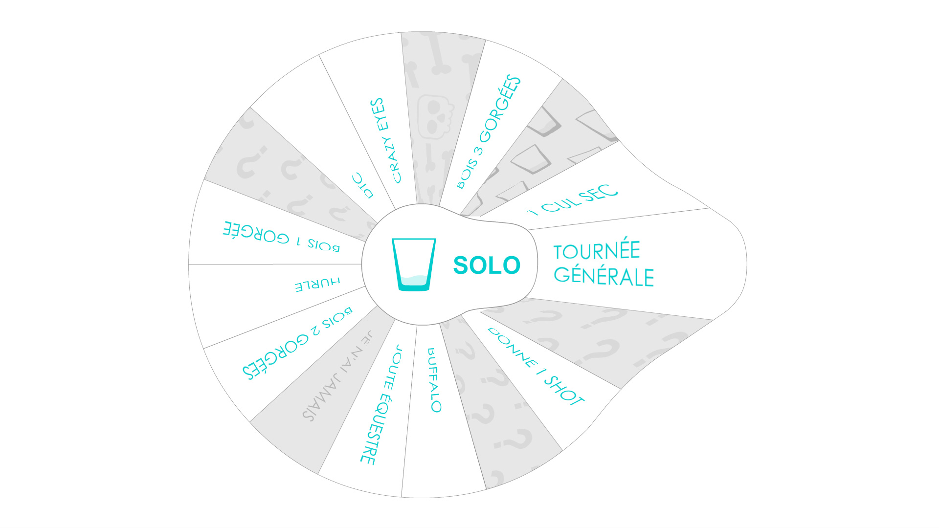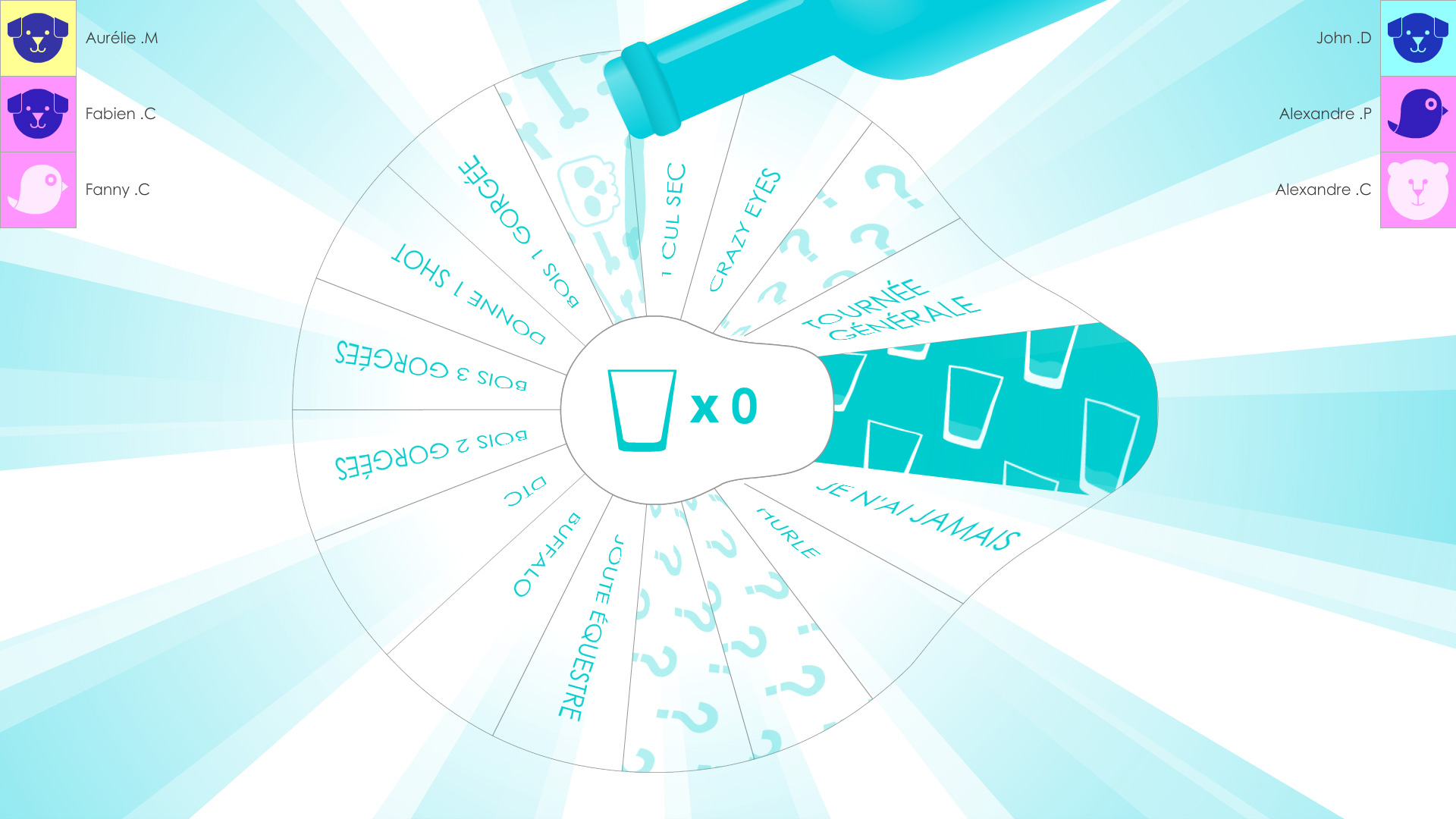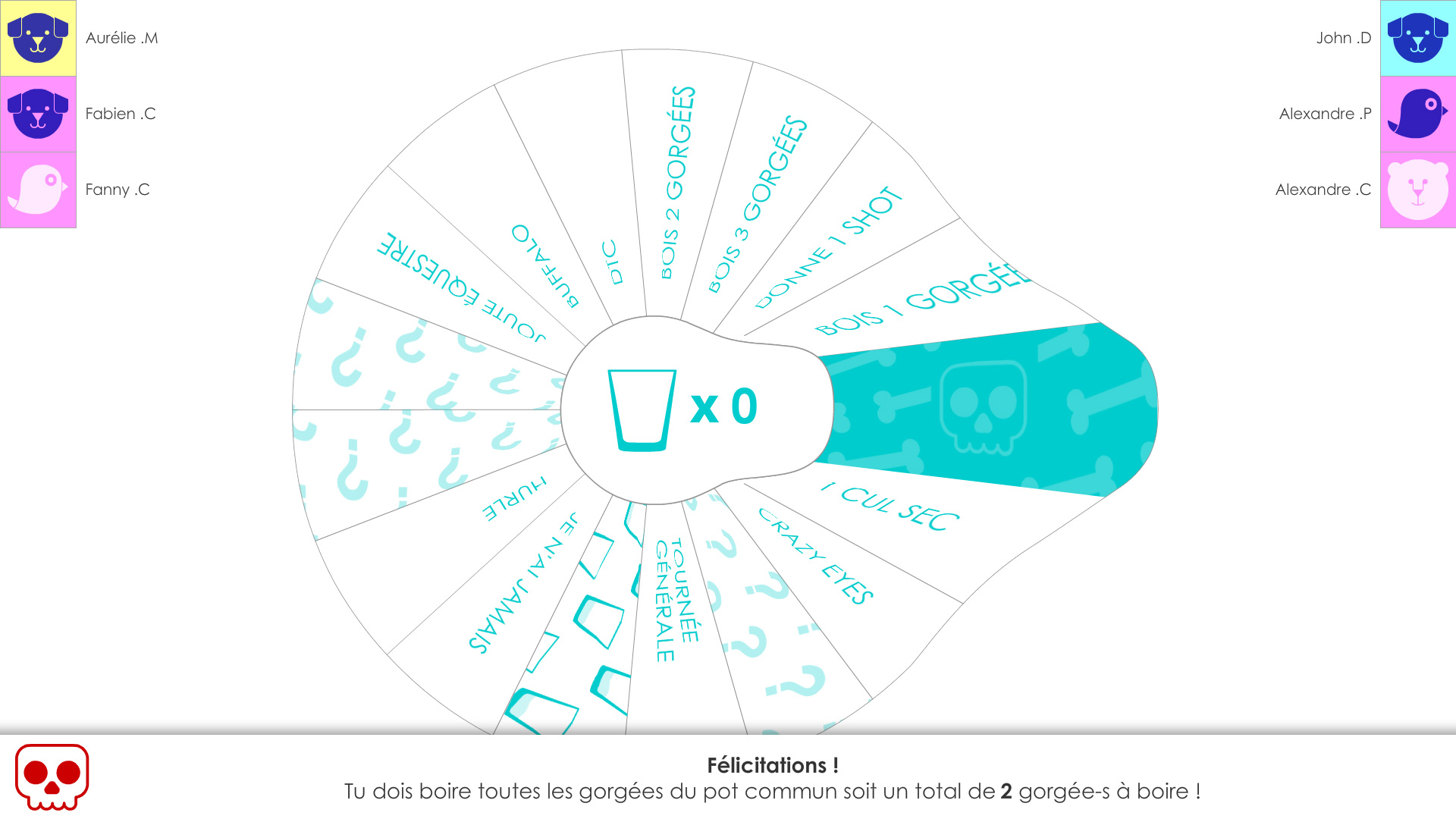 - Drink common sips : drink all the sips added to the center of the wheel