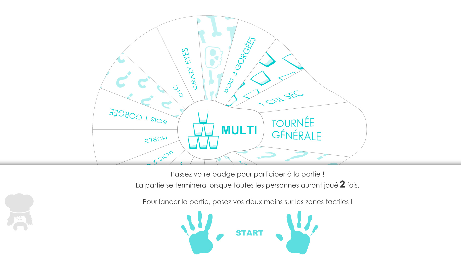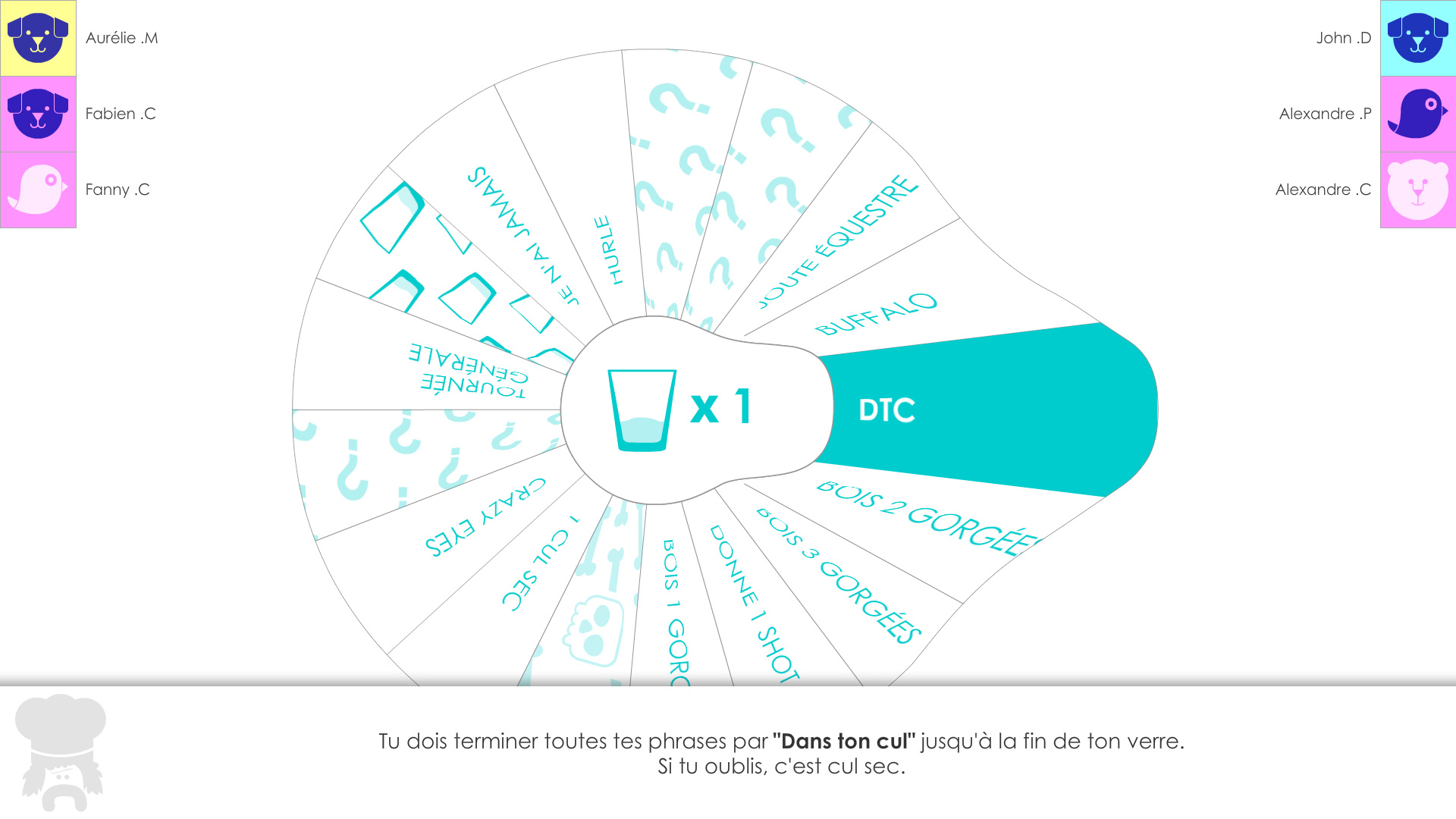 - Avatar : An avatar is displayed during 5 seconds. The player associated to this avatar has to pass his RFID tag before the countdown completes to avoid drinking a sip. If another player passes his tag by mistake, he's the one to drink a sip.