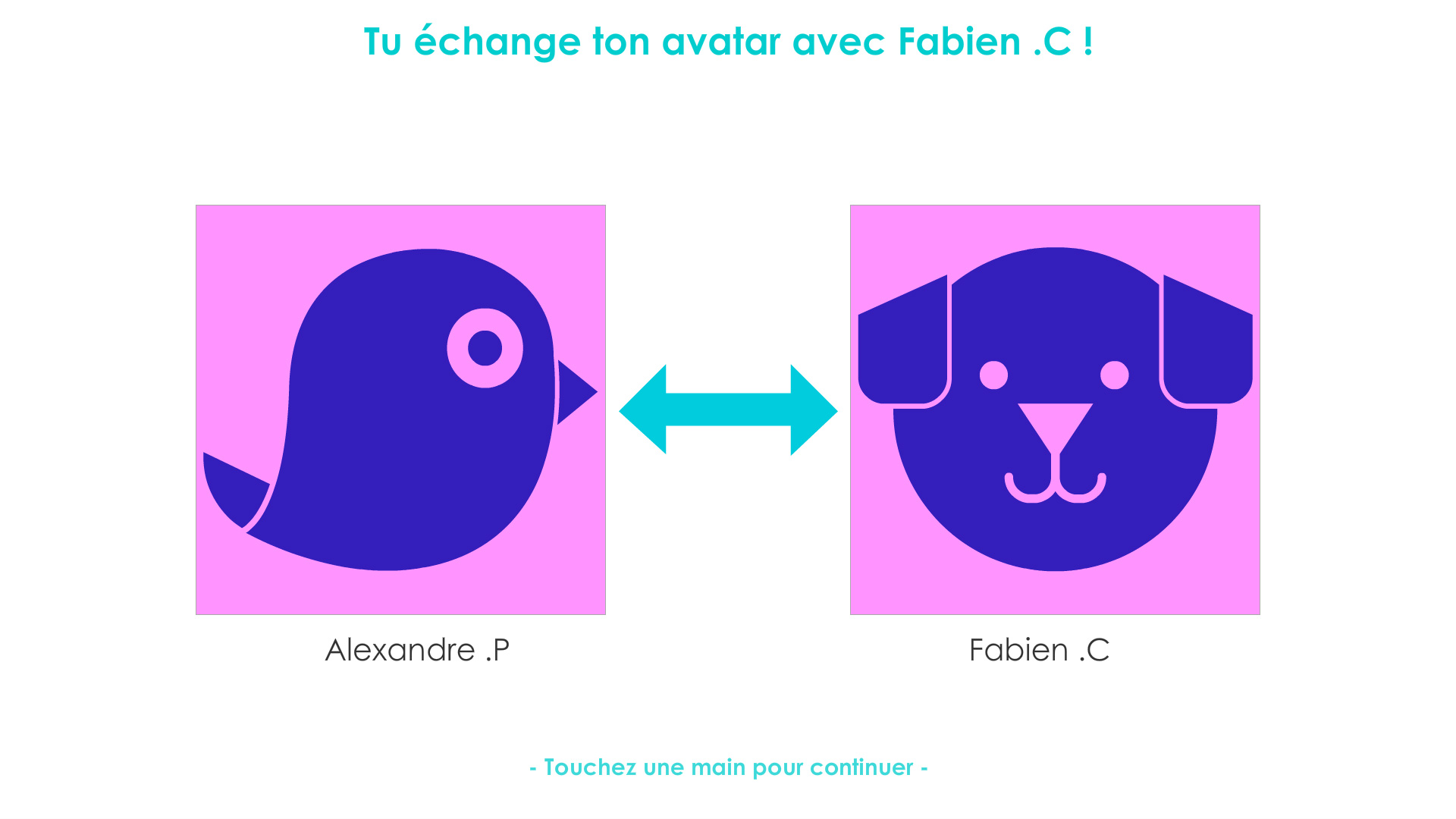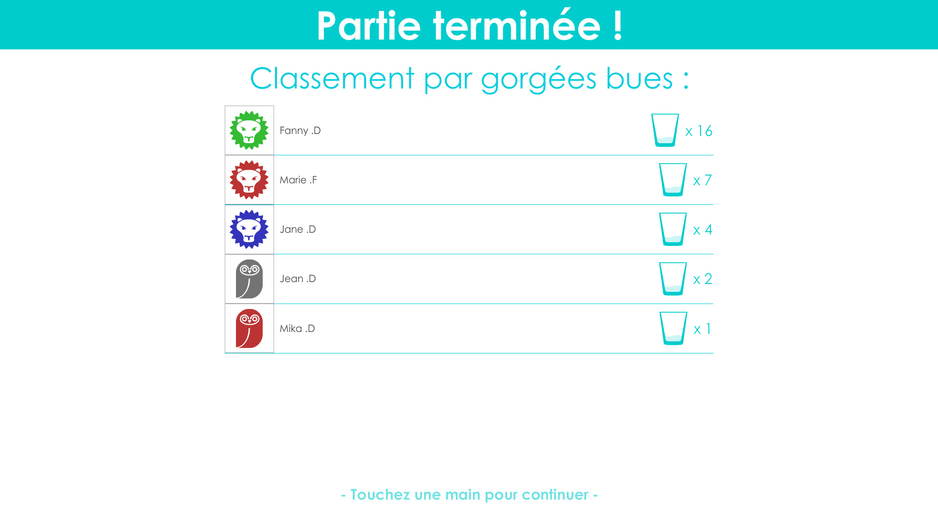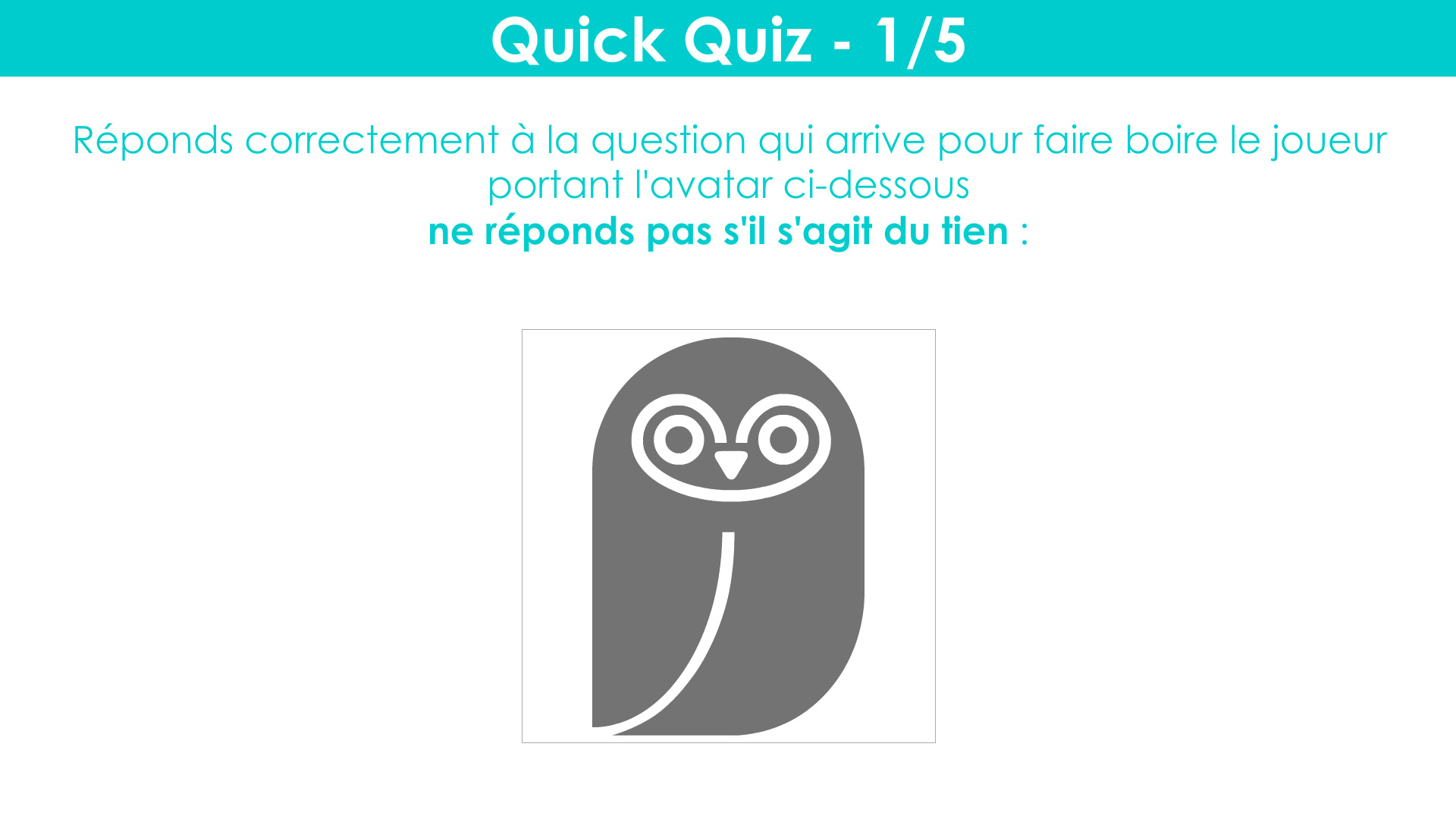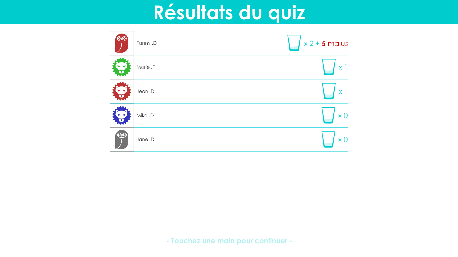 - Quick quiz : The player has to answer questions by tapping the left or the right hand. Every question is associated to a player's avatar so we can choose who we want to make drink sips