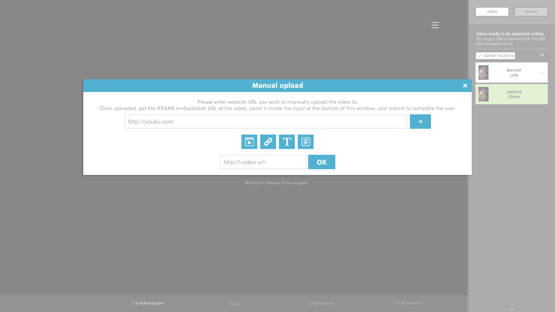 This project is mainly a desktop application made with AIR in charge of detecting when glasses are plugged via USB. When the application detects a pair of glasses it extracts the 2 last pictures and the last video made (after some more or less clever filtering).