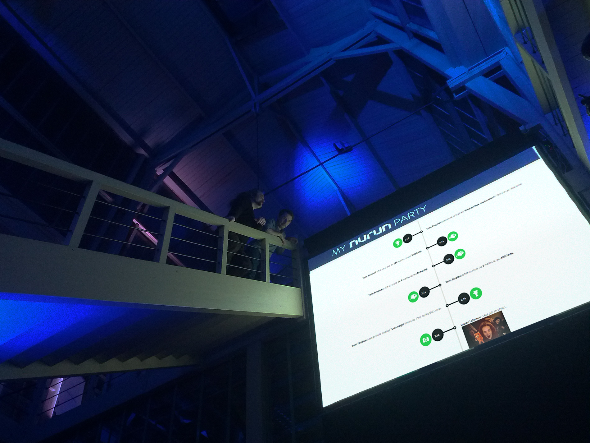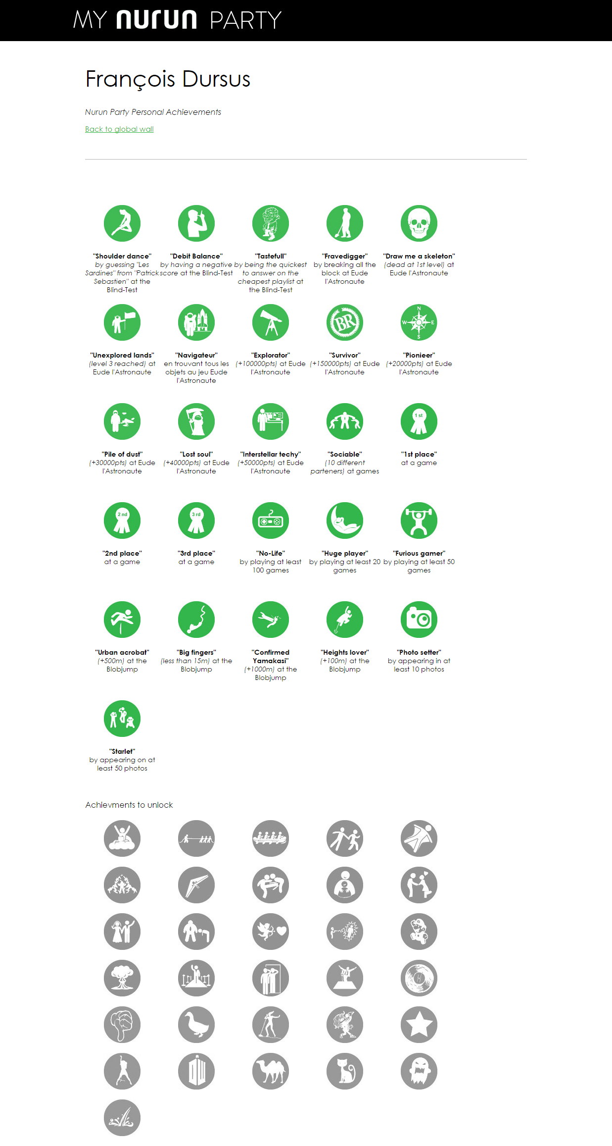 Every single RFID activity generated an event on a global timeline that anyone could see later. Weither it is a voting, a photo tag, a game played, an achievement unlocked, etc... Also, as explained at the begining, evey user also had a personal private timeline with all their activities only. With this page they would, for example, find all the pictures they have been tagged on during the night. This personal page also displayed the achievements unlocked and the one to be unlocked.
