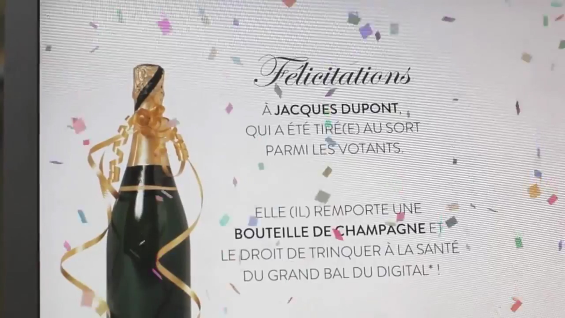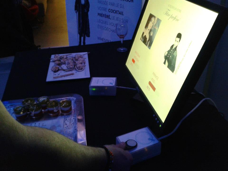 During the party some polls were proposed to the guests. They were able to vote simply by passing their RFID tag over one of the two RFID antena placed in front of the possible answers. Not so usefull except that these kiosks had some instant wins programmed to win a bottle of champagne.