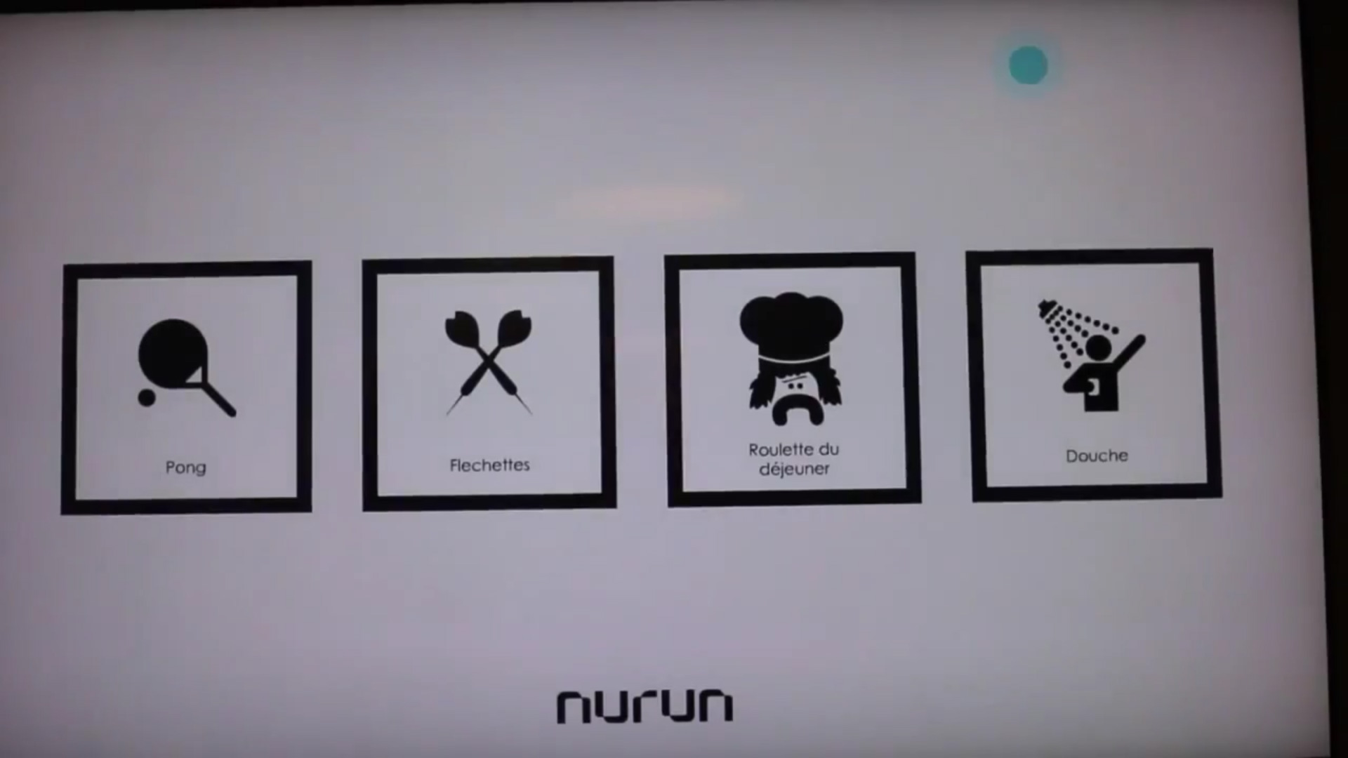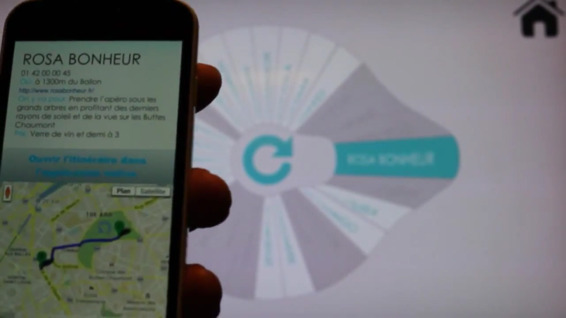 This was more a prototype made for work than something made for the party. It's a wheel with restaurants made to answer the deaily question "Where do we eat today ?". The wheel contains many restaurant and can be launched by mimicking the throwing gesture thanks to a kinect. It is linked to a mobile application that shows a list of restaurant types to be able to disable some restaurants, if we don't want to eat italian, japanese, french, etc.. The user then launches the wheel and the selected restaurant's details is automatically shown on the mobile app with a map showing its direction.